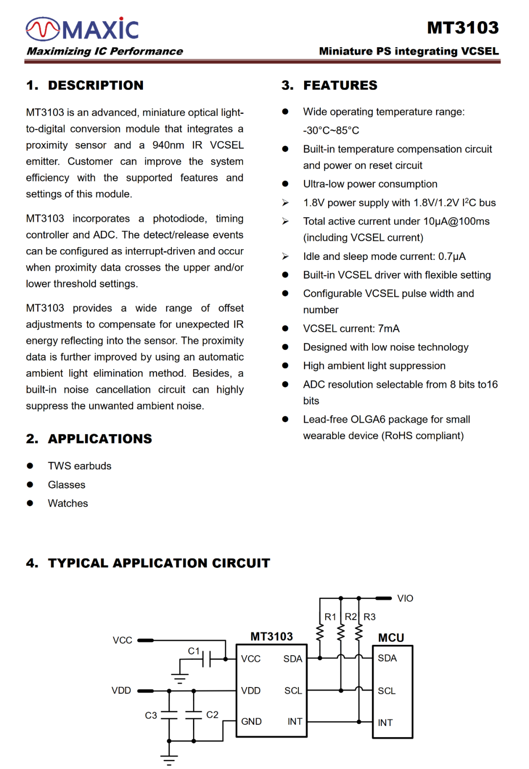 MT3103系列是一款小尺寸、超低功耗、高信噪比、集成940nm VCSEL的數(shù)字光學接近傳感器,待機功耗低至0.7uA,配有公司自研自適應(yīng)底噪抑制算法,有效提升入耳檢測效率。主要應(yīng)用于TWS/OWS等無線藍牙耳機、VR/AR智能眼鏡、智能手表、便攜式智能硬件產(chǎn)品等。