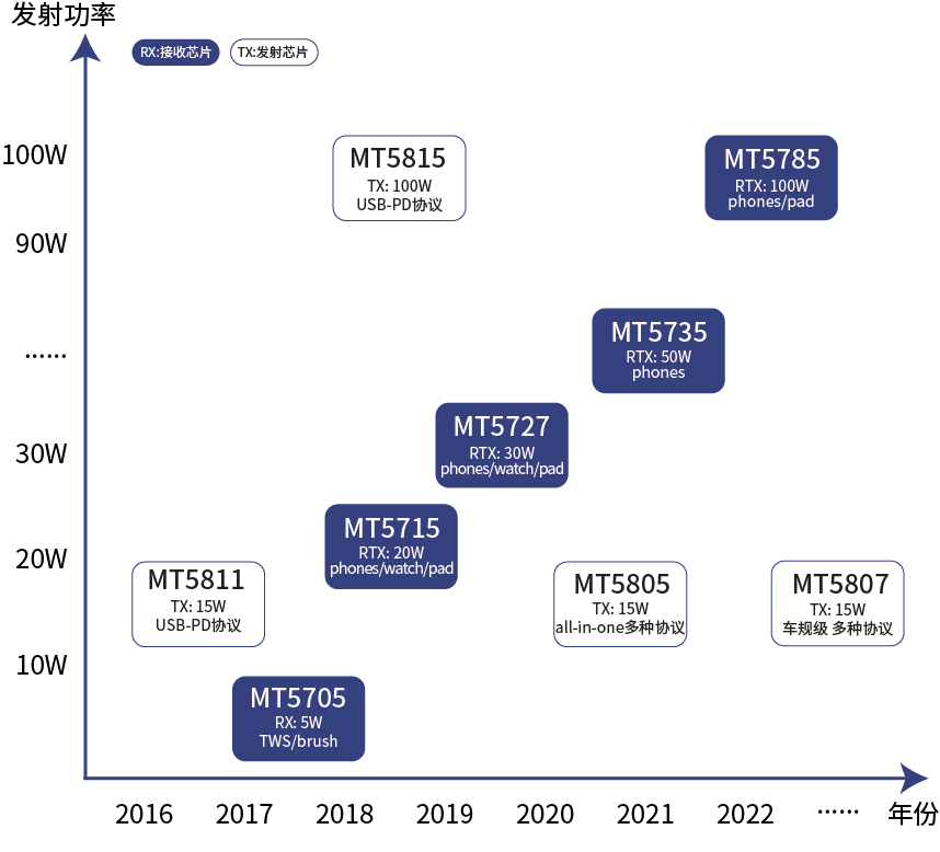 美芯晟無線充電芯片覆蓋不同功率等級(1W~100W)、不同封裝形式(WLCSP、QFN、FCQFN)和不同的數(shù)據(jù)存儲形式(OTP、MTP、FLASH),針對不同的終端產(chǎn)品應(yīng)用,都有針對性的芯片方案,產(chǎn)品豐富度在業(yè)內(nèi)領(lǐng)先。