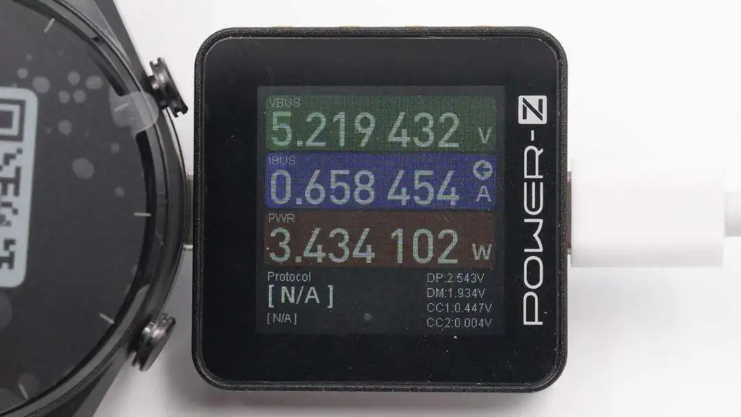 手表內(nèi)置470mAh 超大容量電池,續(xù)航可達(dá)12天,出差一周都不用充電,可以降低外帶成本,和商務(wù)人士絕配。使用包裝自帶的無(wú)線充電底座給手機(jī)進(jìn)行無(wú)線充電,通過(guò)ChargerLAB POWER-Z KM002C測(cè)得輸入功率為5.22V 0.66A 3.43W。