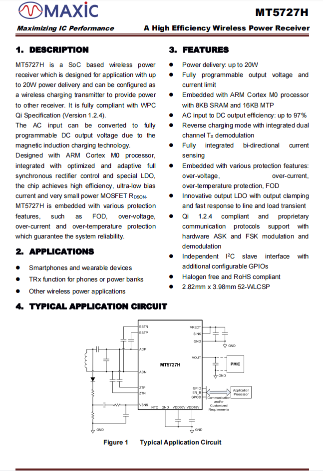 MT5727H內(nèi)置ARM M0處理器,搭配8KB SRAM和16KB MTP存儲(chǔ)器,支持私有無(wú)線充電協(xié)議,芯片內(nèi)部集成同步整流器和LDO,芯片內(nèi)置過(guò)壓過(guò)流保護(hù),支持I2C接口和可配置的GPIO接口。