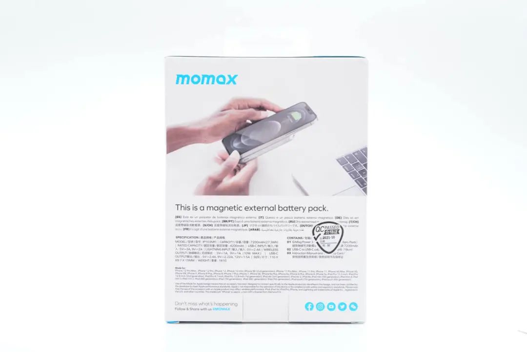 MOMAX摩米士Q.MAG POWER系列磁吸無線充移動電源有多個款式,為蘋果iPhone 12/13手機用戶提供豐富的選擇。最近充電頭網就拿到了該系列7200mAh磁吸無線充電移動電源IP103MFI。