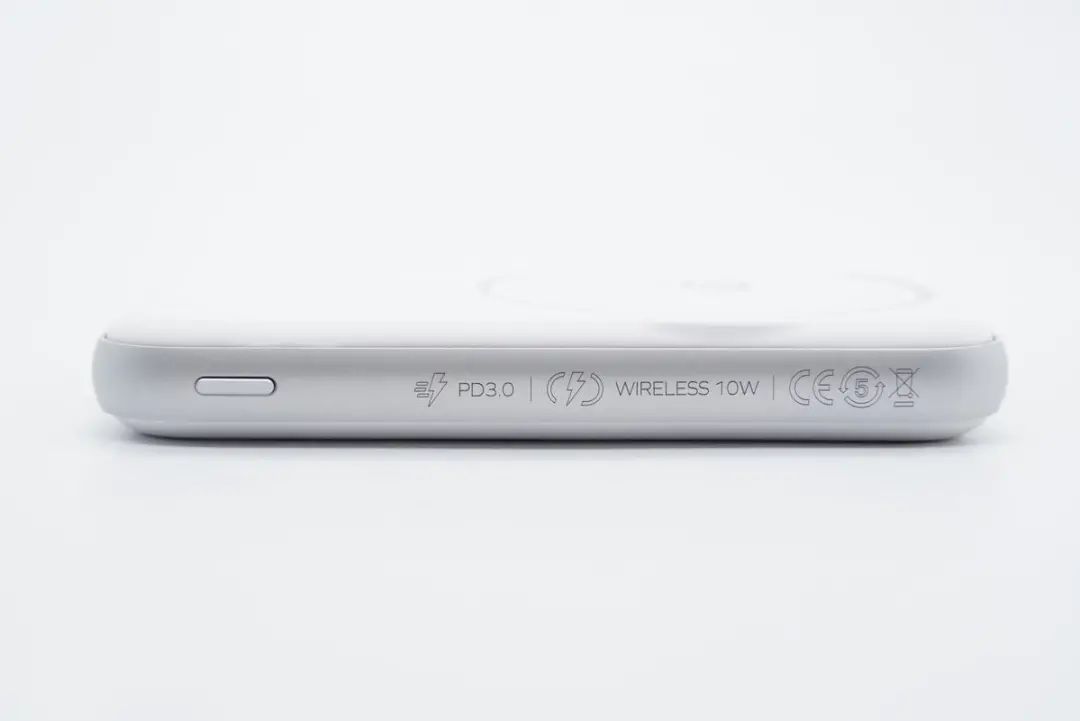 側面設有電源鍵,金屬殼上鐳雕PD3.0無線充標識,充電寶通過了CE認證。