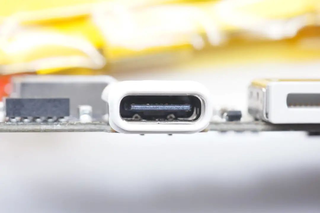 USB-C母座特寫,外套塑料殼絕緣。