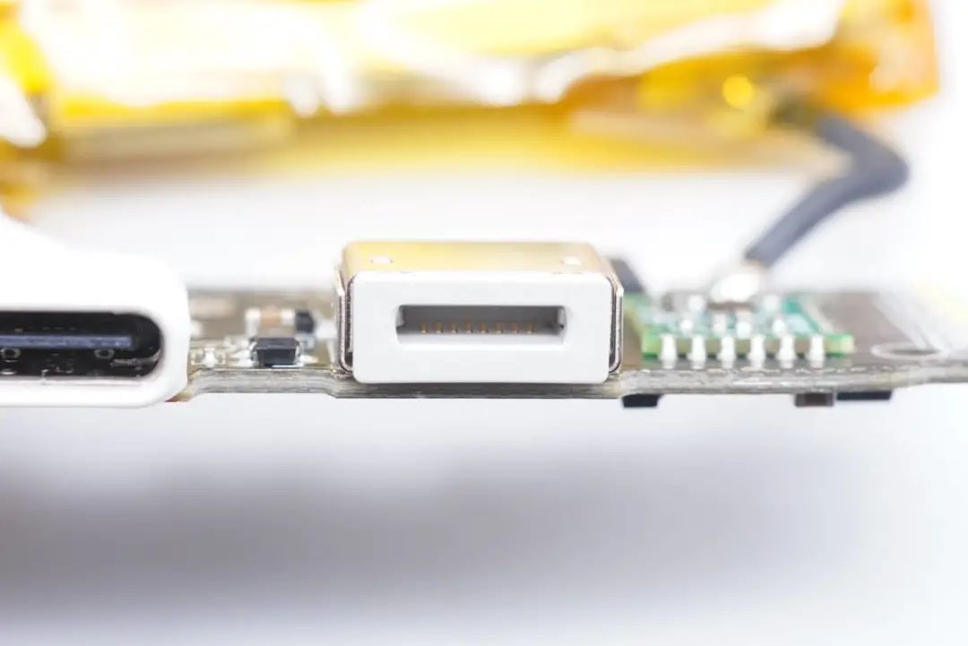 Lightning輸入口旁邊一顆芯片焊接在綠色小板上,絲印610A38,用于MFi認證。