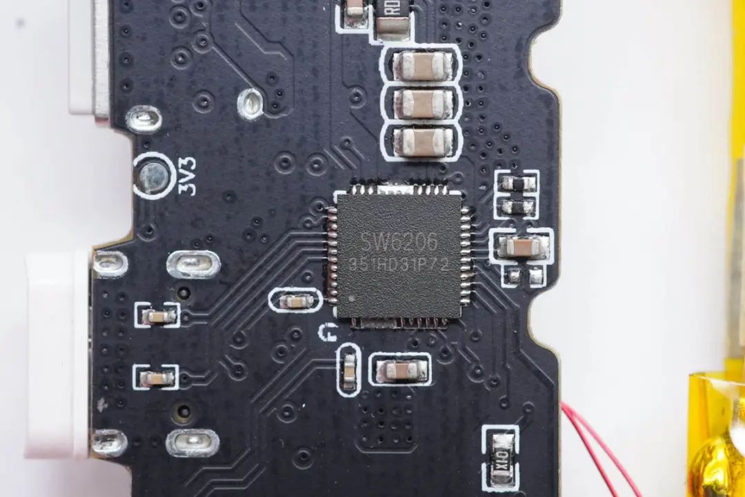 移動電源主控芯片采用智融SW6206。這是一款高集成度的多協議雙向快充移動電源專用多合一芯片,支持A+A+B+C+L口任意口快充。其集成了5A高效率開關充電,22.5W高效同步升壓輸出。