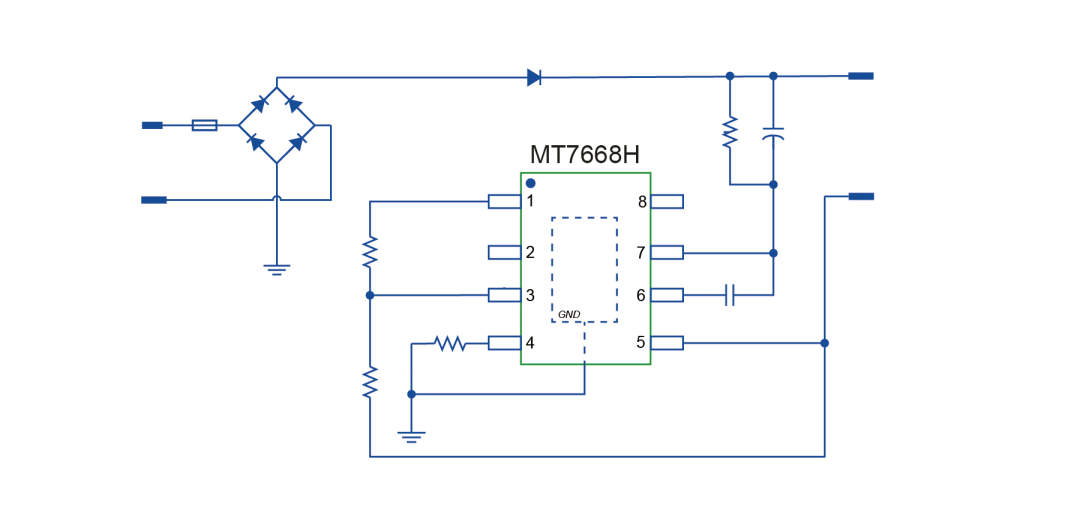 同時(shí),MT7668H內(nèi)部集成高壓功率管和高壓供電電路,無(wú)需電感、變壓器等磁性元件,外圍電路系統(tǒng)結(jié)構(gòu)更加簡(jiǎn)單。