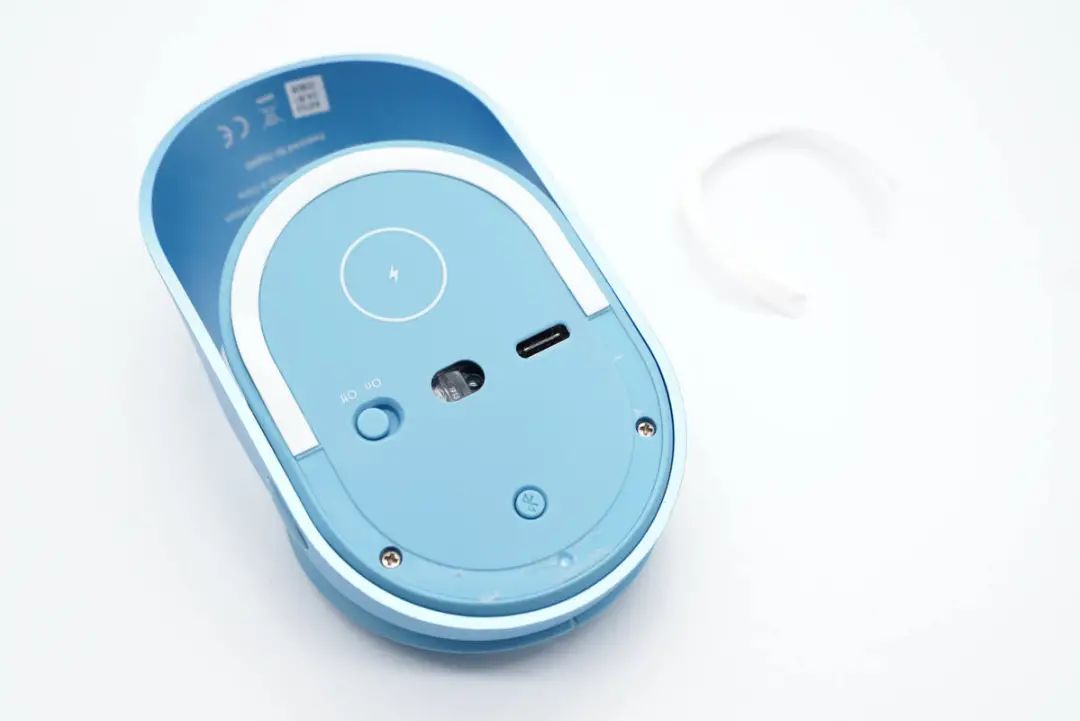 鼠標(biāo)底部邊緣貼有白色聚四氟乙烯腳墊,兩端分別是藍(lán)牙鍵和無(wú)線(xiàn)充電標(biāo)識(shí),兩側(cè)是USB-C充電口和電源鍵。