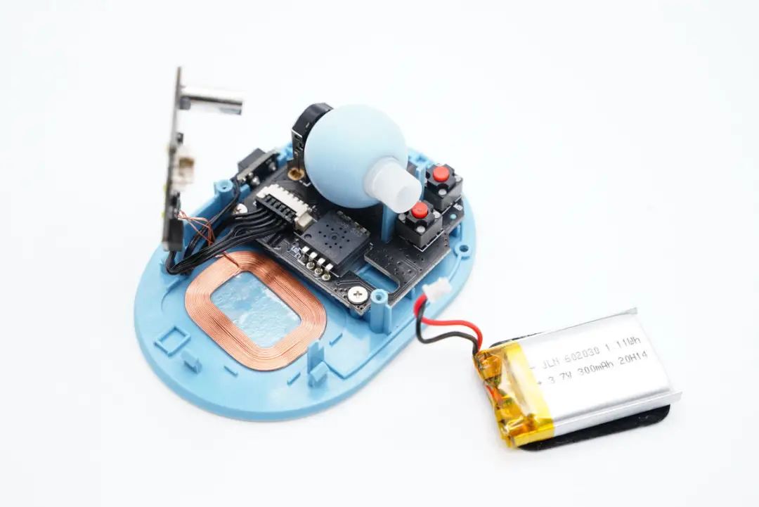 兩塊小板之間也是通過(guò)導(dǎo)線(xiàn)插拔式連接,無(wú)線(xiàn)充電線(xiàn)圈使用雙面膠粘貼在底板上。
