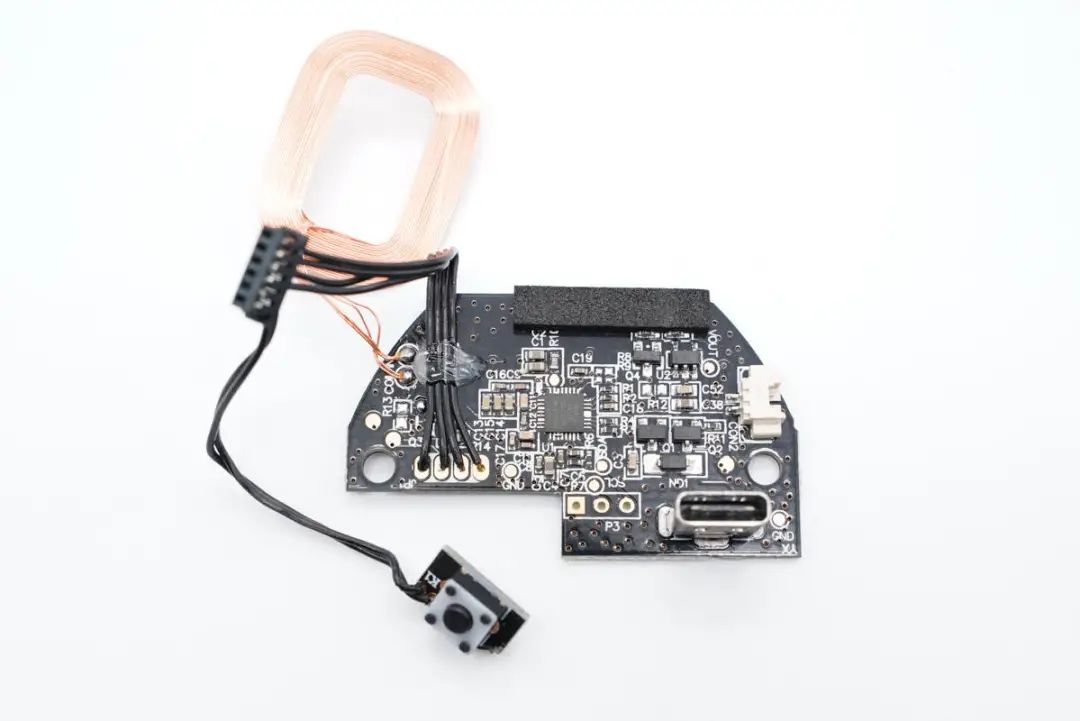 小板正面一覽,垂直焊接USB-C輸入母座,右側(cè)是電池插座,左側(cè)連接導(dǎo)線(xiàn)和無(wú)線(xiàn)充電線(xiàn)圈,中心是無(wú)線(xiàn)充電接收芯片。