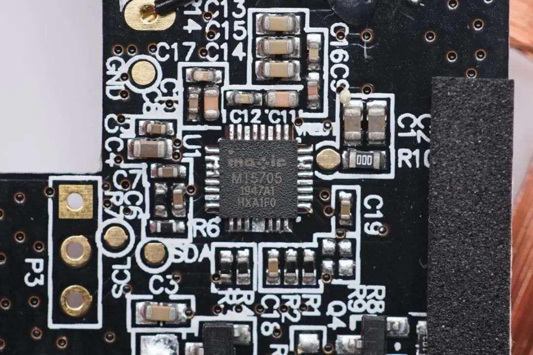 無(wú)線(xiàn)充電接收芯片采用美芯晟MT5705,上方三顆諧振電容并聯(lián)。MT5705是一款基于磁感應(yīng)的無(wú)線(xiàn)充電接收器的SoC(片上系統(tǒng)),采用嵌入式ARM Cortex M0處理器,2KB SRAM, 8KB OTP,完全符合BPP的最新WPC Qi規(guī)范(版本1.2.4)。
