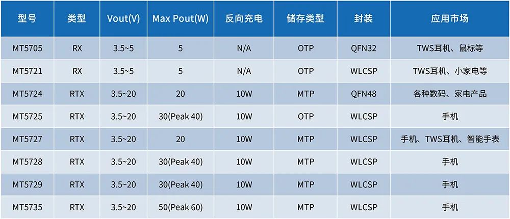 此次展示的接收端產(chǎn)品有MT5705,MT572X系列以及MT5735。功率覆蓋5W至50W,根據(jù)市場(chǎng)需要可支持反向充電功能,產(chǎn)品可廣泛應(yīng)用在手機(jī)、智能手表、TWS耳機(jī)、小家電、數(shù)碼等智能產(chǎn)品中。