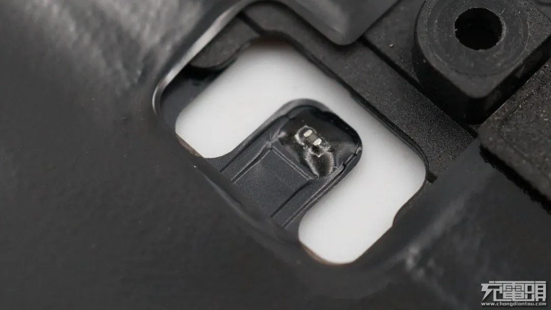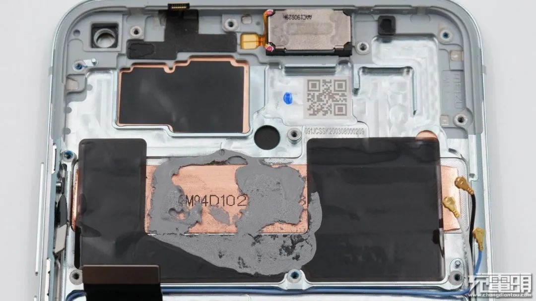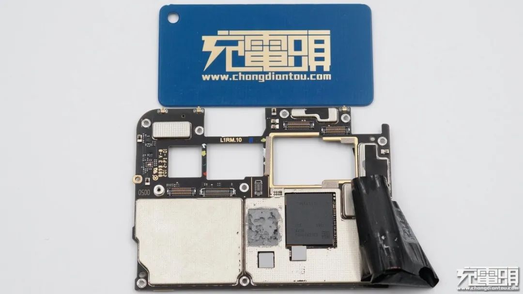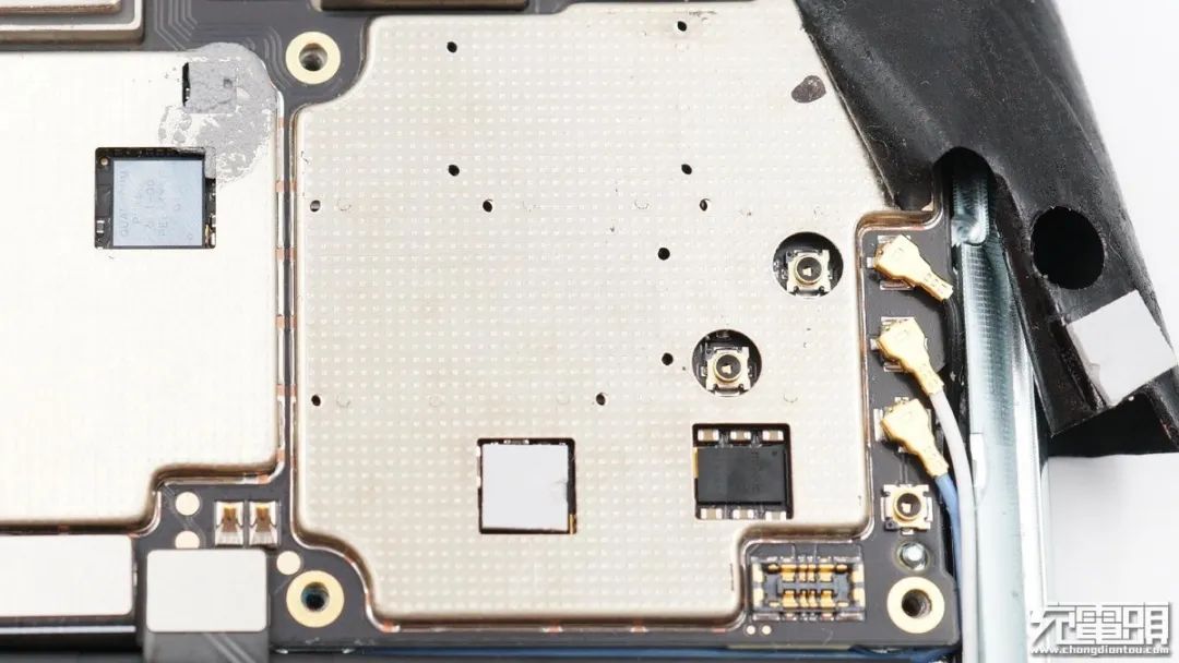 電池和主板之間為插座可拆卸設(shè)計,組裝方便,也方便后面對電池進行更換等服務(wù),同時電池保護板背面與鋁合金中框之間還有一條導(dǎo)熱硅膠,在高速充電時可為保護板散熱,降低溫升。