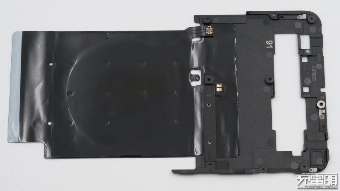 背面一覽,無線充電線圈與主板通過連接器連接,方形觸點為NFC線圈觸點。
