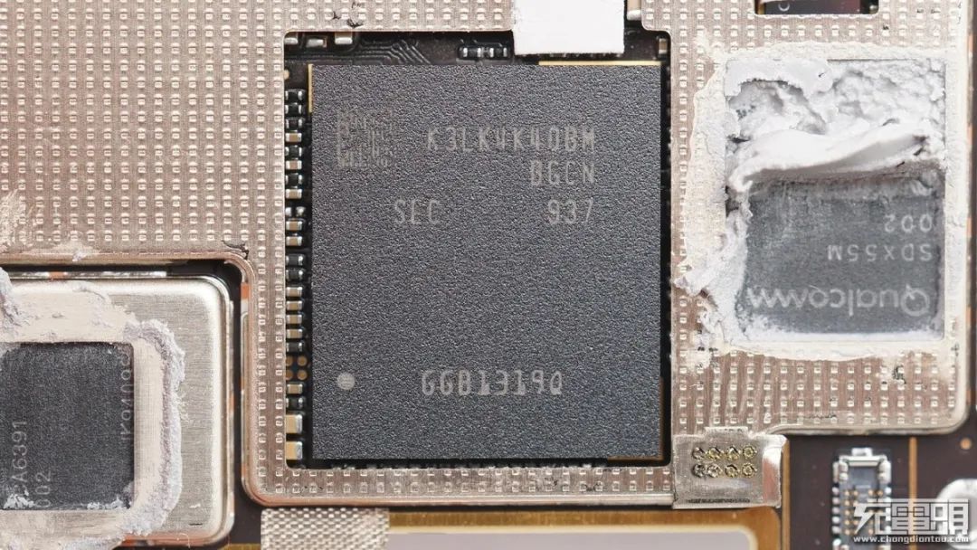 三星 K3LK4K40BM 12G LPDDR5內(nèi)存,下面是高通驍龍865 處理器。