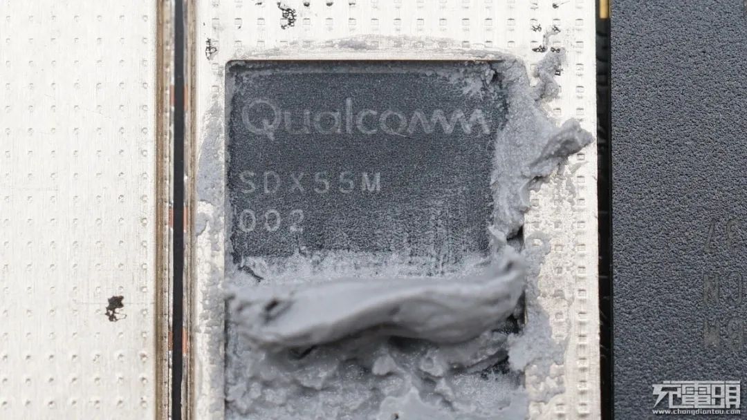 高通 SDX55M,第二代5G調(diào)制解調(diào)器,由導(dǎo)熱硅膠覆蓋散熱。