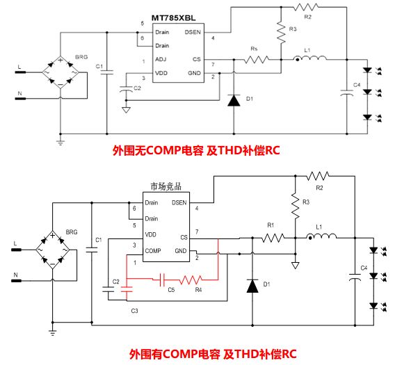MT7855BL日光燈方案管腳兼容業(yè)內(nèi)同類產(chǎn)品,客戶替代不需要更換PCB,直接去掉COMP電容及補償?shù)腞C即可。