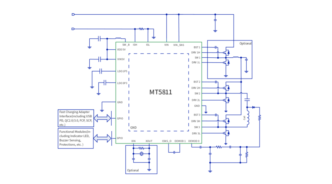 MT5811是一款集成USB PD、QC等快充協(xié)議、高度集成的符合WPC Qi最新標(biāo)準(zhǔn)的無線充電發(fā)射芯片,支持15W輸出功率。MT5811集成ARM M0 處理器,擁有卓越的高效率和緊湊設(shè)計,提供強(qiáng)大、自主的二次開發(fā)空間。芯片內(nèi)部集成3對NMOS驅(qū)動器,可用于單線圈應(yīng)用的無線充電器,支持定頻調(diào)壓控制,無需外置驅(qū)動器。