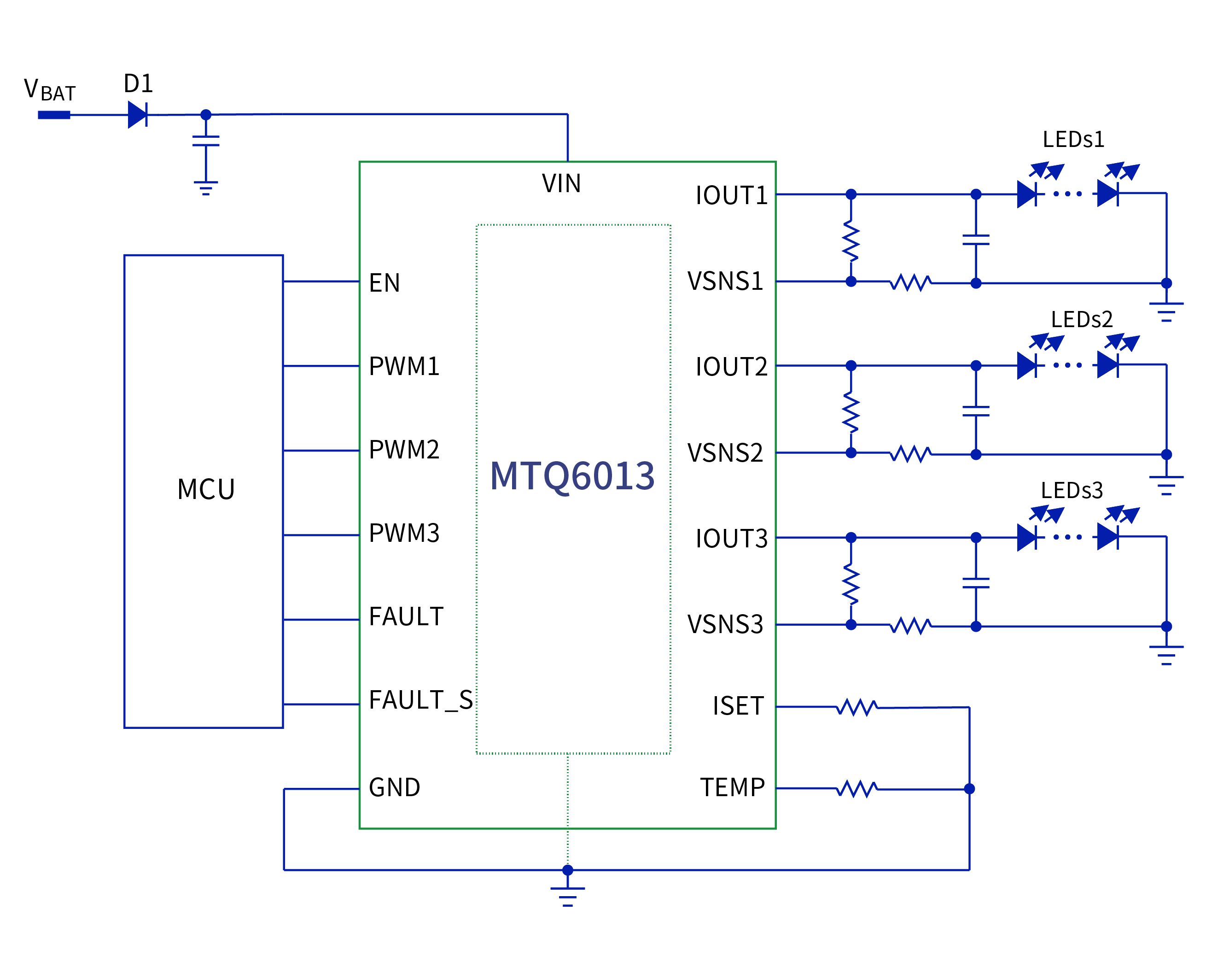 MTQ6013 is an automotive-grade 3-channel linear constant current LED driver, whose output current can reach 160mA per channel, and 480mA when three channels are paralleled.