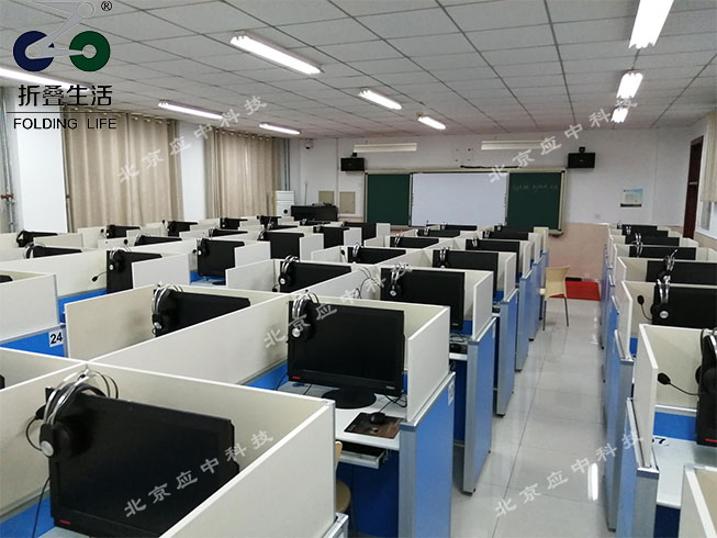 房山區(qū)實驗中學完成3間教室總共132座英語聽說機考卡座的建設(shè)任務(wù),北京應(yīng)中科技有限公司的英語聽說機考卡座,是一款自帶升降擋板的多功能電腦桌,又稱智能升降屏風卡座,屏風升起來可當做英語聽說標準化考場使用,屏風降下去可以作為普通電腦機房進行計算機課程教學和練習,實現(xiàn)了一室多用、 考學合一。