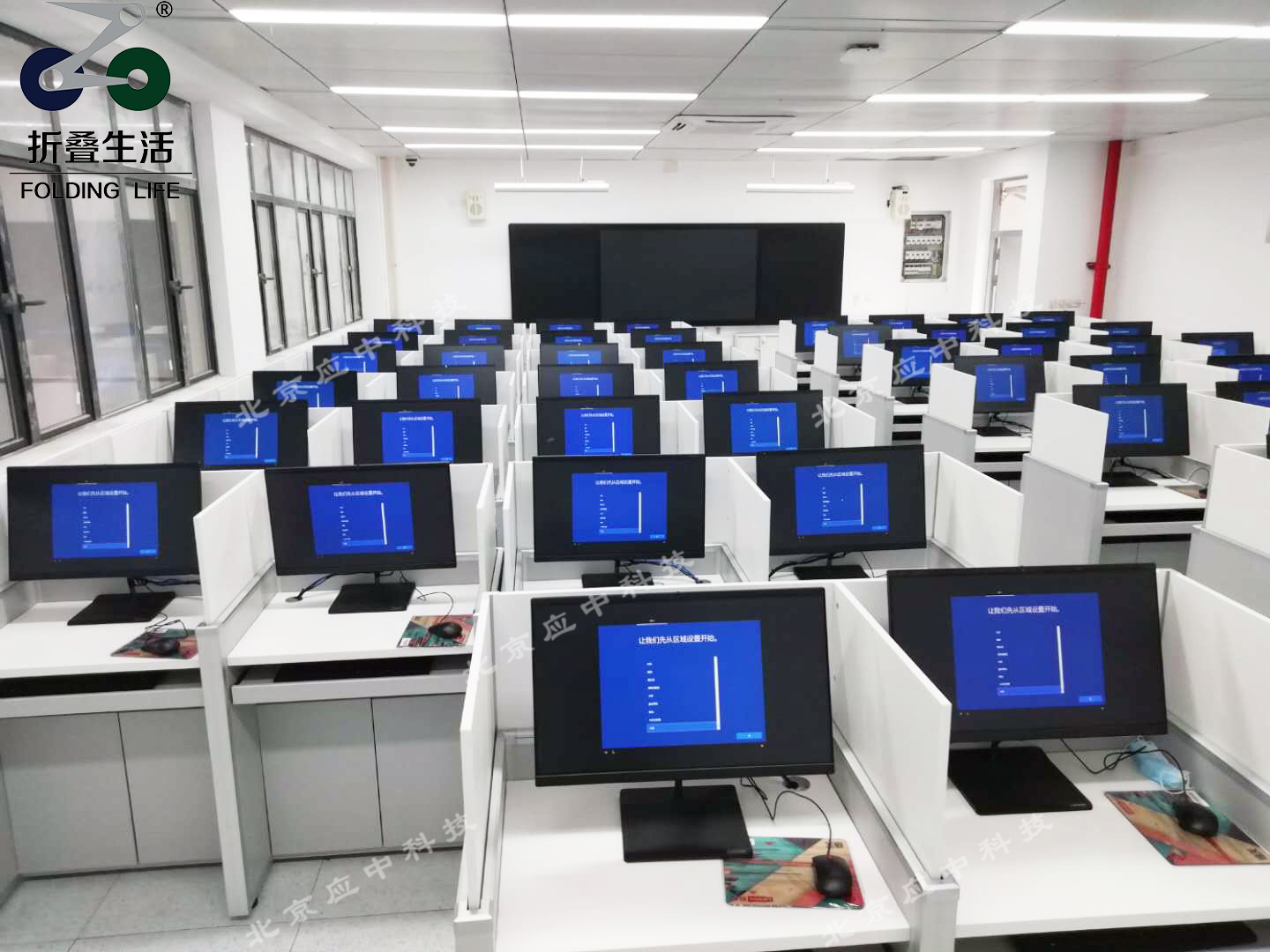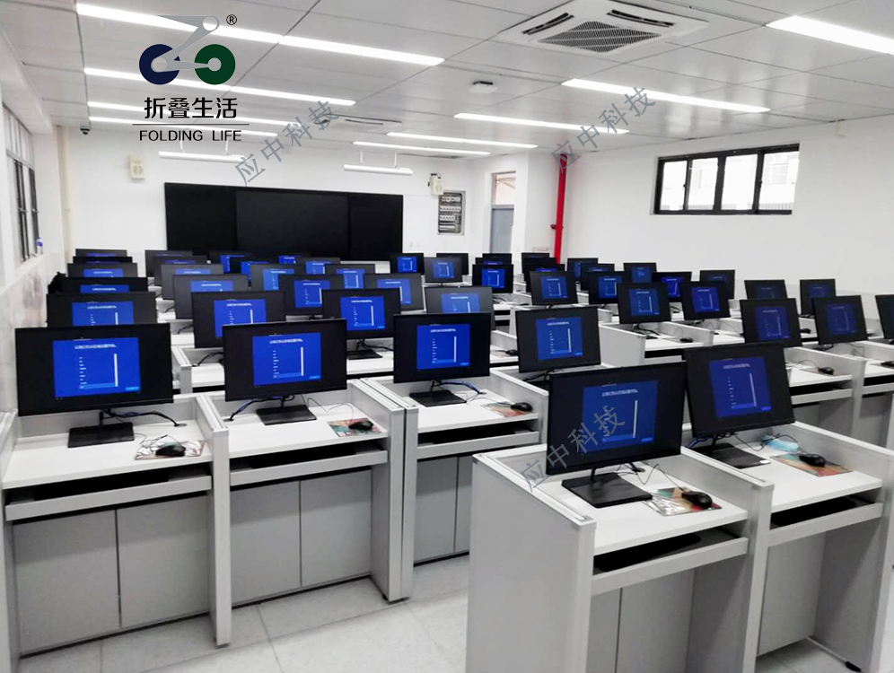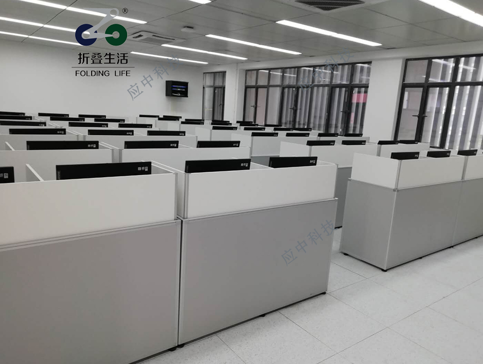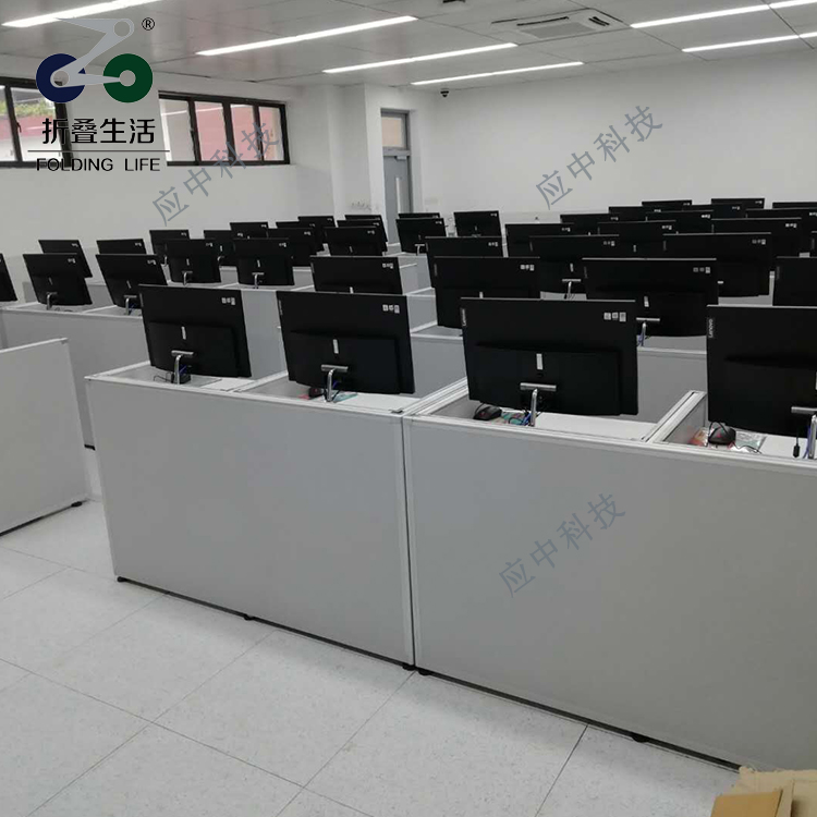 升降屏風機考卡座電腦桌安裝在教室的時候,教室可實現(xiàn)一室多用,當屏風升起后,可當做英語聽說標準化考場,當屏風降下后,可當做多媒體教室使用的。它專為外語標準化考試而設計的電腦桌,屏風升起后可有效的隔斷相鄰人的正常視線,可達到互不干擾的作用。